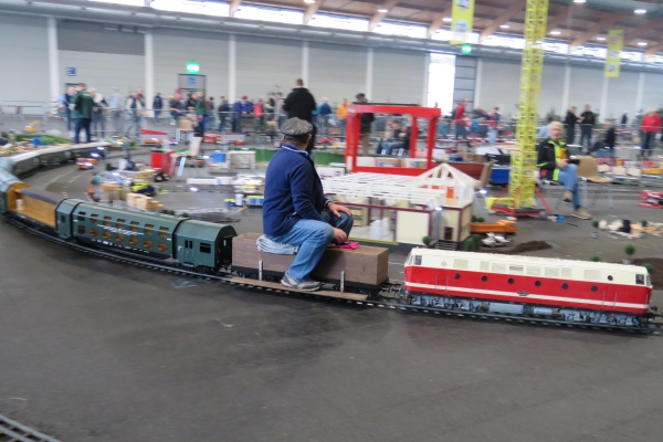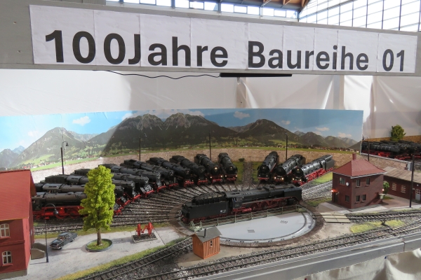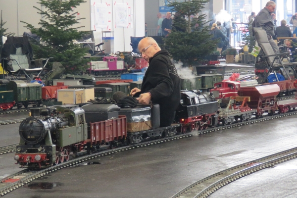Wegen unserer kürzeren Besuchszeit von nur rund 1,5 Tagen konnten wir uns auch nur relativ kurz in den anderen Hallen der Faszination Modellbau umschauen. Es reichte für einen schneller Blick in die LEGO-Welt und auch mal zu den funkgesteuerten Baggern. Bei den Schiffen im großen Wasserbecken schauten wir vorbei als bei Wind aus Ventilatoren richtig gesegelt wurde. Etwas mehr Zeit gönnten wir uns für die ausgestellten Eisenbahnanlagen; da waren sehr interessante und schöne Sachen dabei. Geschmunzelt habe ich z.B. über die Schienenkreise in Spur Z auf einem Bierdeckel und etwas Besonderes waren die rund um eine Drehscheibe präsentierten Dampflokomotiven der Baureihe 01 in der Spur I anlässlich von 100 Jahren dieser Baureihe. 14 Stück dieser dicken Loks in 1:32 sieht man sicherlich nicht sobald wieder. |