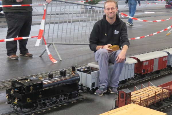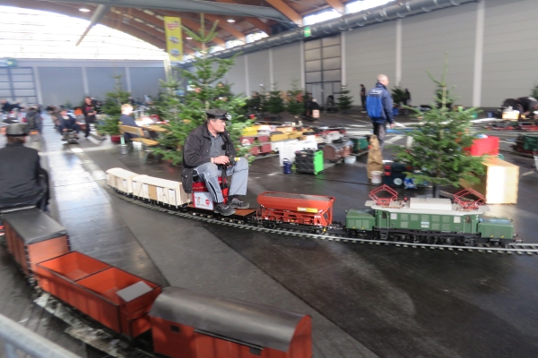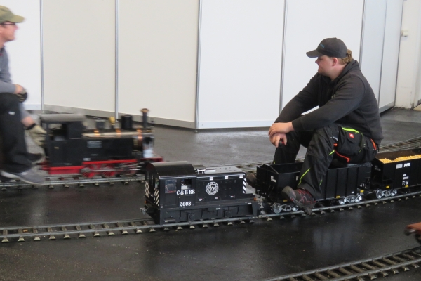 Interessanter weise hatte der Zug von Christian mit der E94 einen Sitzwagen nur für eine Person, während der Bedienwagen für Christians Köf Platz für zwei Passagiere bot. Zunächst fuhr ich für einige Runden die E94, Christian und Susanne die Köf. Später tauschten wir und ich war mit der Köf auf der Strecke. Nach einer Runde wurde diese immer langsamer und ich ahnte, dass die Batterie mehr als nur schwächelte. Letzten Endes kam ich nicht drumherum die Köf über den größten Teil der 5-Zoll-Strecke zu schieben um keinen Stau zu verursachen. So mancher Besucher am Rande machte von diesem Missgeschick Fotos, aber das kann eben immer mal vorkommen. |