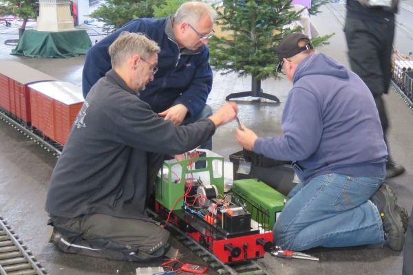 Volker half hier und da bei Problemen mit Lokomotiven. Garrelts Elektrolokomotive funktionierte zunächst, später fuhr sie nicht mehr. Volker fand die Ursache darin, dass in der Lokomotive ein 24-Volt-Relais eingebaut war, obwohl es lediglich eine 12 Volt Batterie gab. Bei voll geladenem Akku schaltete auch das 24-Volt-Relais noch korrekt. Nahm dann die Akkuspannung während des Betriebs etwas ab, funktionierte das falsche Relais nicht mehr und die Lokomotive blieb stehen. Nachdem der Grund für die Fehlfunktion bekannt war, war auch schnell eine Lösung des Problems gefunden. |