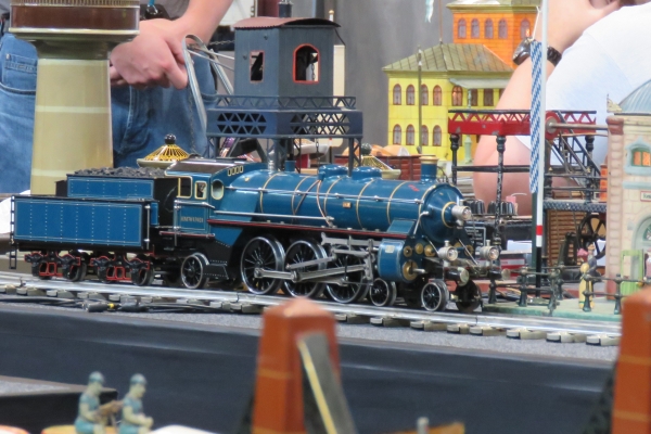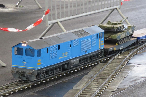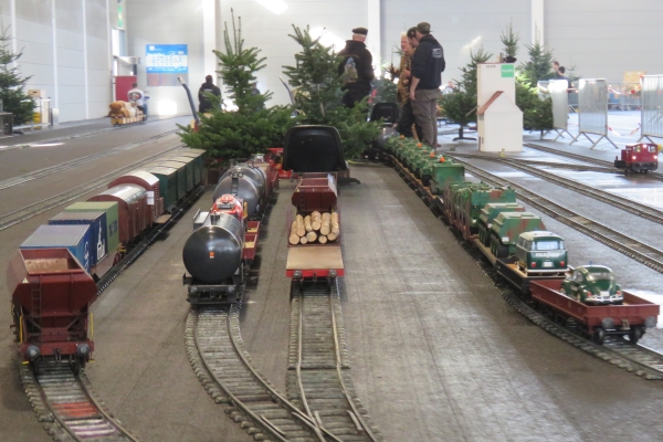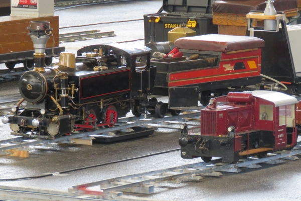 Die Eisenbahnanlage für 5 Zoll und die für 7 ¼ Zoll war in etwa wie in den vorigen Jahren aufgebaut worden, nur um die Abstellgleise waren Veränderungen durchgeführt worden, um die Platzangebote zu verbessern. Insgesamt war die Anlage sehr gut ausgelastet, denn alle Abstellgleise waren belegt und mehr Züge waren auf der Strecke kaum möglich ohne dass der Betrieb ins Stocken hätte kommen können. Somit war ständig ein recht lebhafter Betrieb auf den Gleisen und die Besucher konnten jederzeit abwechslungsreichen Eisenbahnverkehr beobachten. Durch den umfangreichen Betrieb wurden bereits am Freitagnachmittag die Gleise rutschiger und es musste feinfühliger gefahren werden, damit die Antriebsräder nicht schleuderten. |