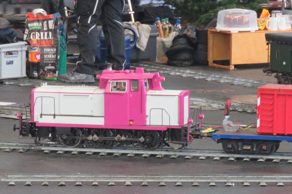 Noch ein paar Details. Wolfgang Fischer entgleiste wie andere zuvor auch mit seiner Dampflokomotive BR23 auf einer Weiche zur Abstellgruppe. Man erkannte, dass die Weichenzunge nicht mehr richtig am Schienenprofil anlag. Norbert passte daher die Schienenprofile der Weiche vorsichtig mit einer Flex an. Danach kam es nicht mehr zu Entgleisungen an dieser Weiche. Garrelt war mit zahlreichen Fahrzeugen von Borkum gekommen. Am Markantesten war wohl sein Thekenwagen mit verschiedenen alkoholischen Angeboten. Immer wenn dieser Thekenwagen geöffnet wurde kamen recht bald eine größere Gruppe rund um diesen Sonderwagen zusammen und ließen sich die Leckereien schmecken. Und aufgefallen ist mir ein Feldbahnzug mit offenen Wagen und größeren Teddys darin. Ein Bärenzug so wie der meine war das allerdings nicht. |