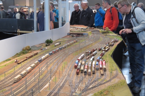 Natürlich trug ich mein Sweatshirt und die zugehörige Fleecejacke mit dem Aufdruck meines Vereins der Karlsruher Dampflokfreunde. Aber ich war in den Eisenbahnhallen nicht der einzige mit diesem Logo auf der Kleidung. Ich traf den „halben“ Verein gemeinsam beim Eisenbahnfahren; obwohl ich „nur“ Besucher war, schaute ich natürlich am entsprechenden Standort in der Halle vorbei. Einige Vereinskameraden hatten beim Gleisaufbau der beiden Anlagen geholfen und waren deshalb schon länger Zeit hier auf der Messe und hatten sich daher mit ihren Fahrzeugen und allen Extras „gemütlich“ eingerichtet. |