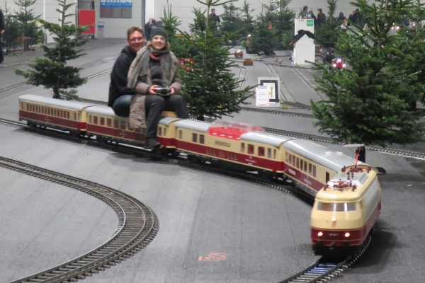 Und Thomas sprach mich während der Fahrt mit seinem TEE-Zug an. Ich hatte nicht gewusst, dass er von Thomas diesen Zug übernommen hatte. Also Thomas kaufte von Thomas die E-Lok 103 und die TEE-Wagen. Später erzählte er mir, dass er noch zwei weitere Bausätze von TEE-Waggons und einer entsprechenden Lok hätte, sodass der Zug noch länger würde. Und dann bot auch er mir an, einige Runden mit dem beige-roten Personenzug zu fahren. Es war etwas Besonderes mit den langen Wagen über die Strecke zu fahren. Susanne nutzte dies sogar vom letzten Waggon für ein kurzes Stück aus. Wegen der ungünstigen Sicht nach vorn konnte man jedoch nicht dauerhaft den Zug von ganz hinten steuern. |