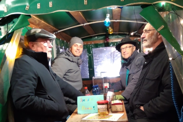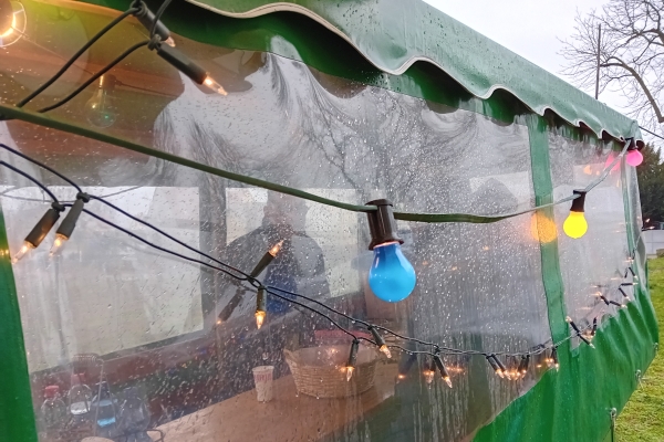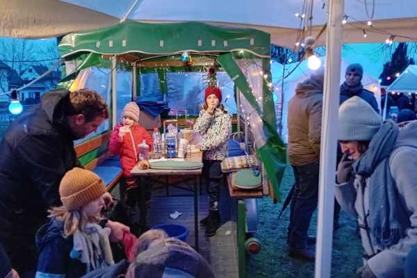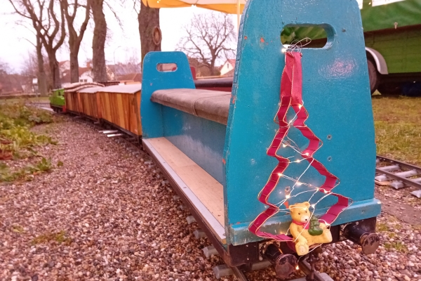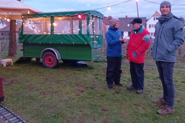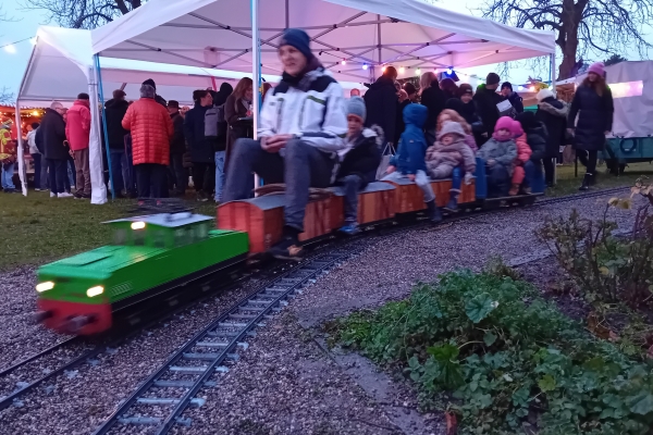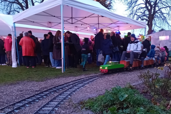 Zum 40. Mal fand in Friedelsheim der Weihnachtsmarkt zugunsten für "Brot für die Welt" statt. Leider hatte das Wochenende eine schlechte Wetterprognose. Für Samstag wurde erst für den späten Nachmittag Regen vorher gesagt, für den Sonntag sollte es ganz schlecht aussehen, sodass sogar Udo meinte, ob wir nicht zusammen packen sollten. Aber dennoch gab es regenfreie oder nur ganz wenig nieselnde Zeiten, die ein Fahren ermöglichten. Es war auch immer wieder ein Abschätzen, ob man noch eine Runde weiter fuhr, wenn es „spritzelte“ oder doch die Regenplanen über die Züge zog. |