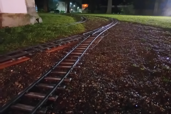 Mir gefällt die kleine 5-Zoll-Anlage an der Kirche sehr gut. Seit der Erweiterung 2019 fährt man nicht nur im Kreis bzw. Oval sondern eine abwechslungsreichere Strecke. Streckenteile liegen im Licht der Lampen andere Abschnitte etwas im Dunkeln. So ergab sich ein besonderes Fahrgefühl im Dunkeln bzw. Halbdunkel und dazu auf nassen Schienen die im Fremdlicht spiegelten. Trotz der nassen Gleise hatte ich keine Traktionsprobleme, auch in der kurzen Steigung in der Kurve konnte ich nach einer Entgleisung wieder anfahren. |