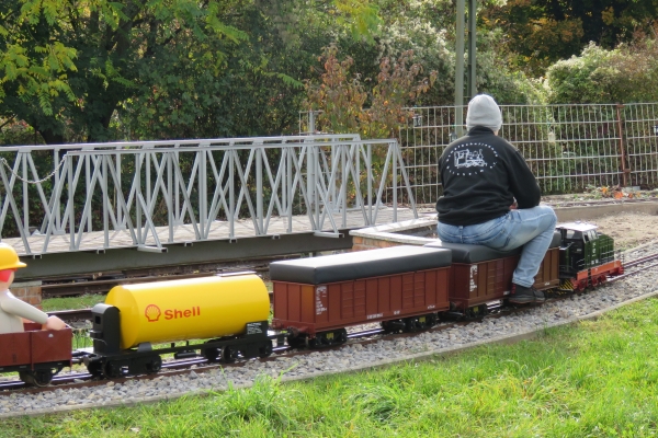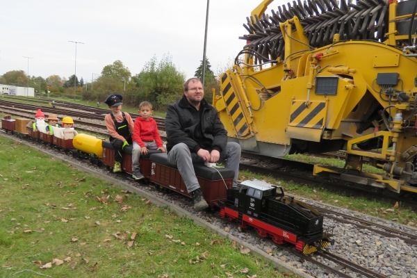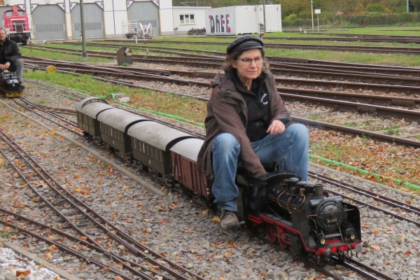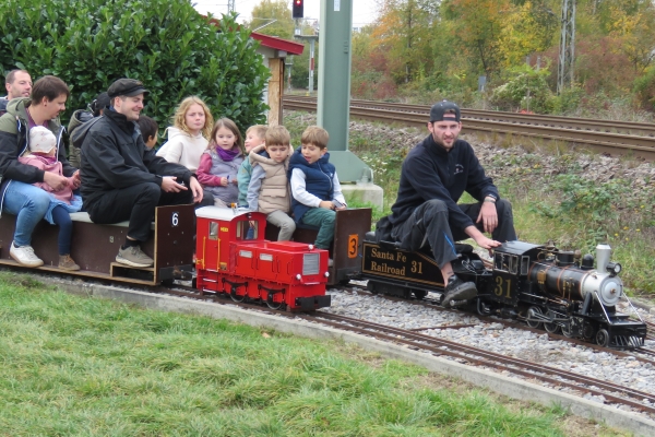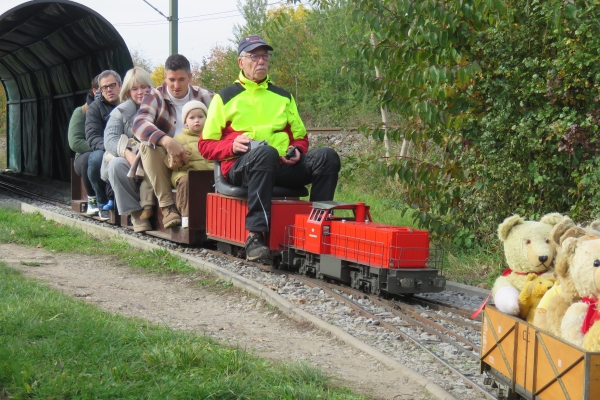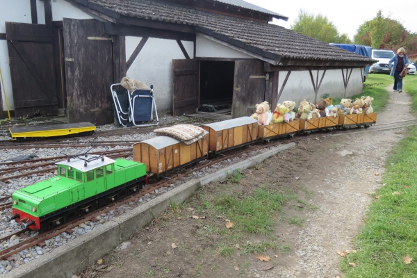 | Wegen der immer noch vorhandenen Schuttberge der Bahn vor der Anlage war die Parkplatzsituation erneut schwierig, sodass ich erst gar nicht mit dem PKW-Anhänger nach Karlsruhe kam. Im Auto hatte ich die E22, zwei Sitzwagen und drei offene Teddy-Waggons mit 18 Bären. Mehr ging nicht, da auch meine Frau mit nach Karlsruhe kam um hier Susanne zu treffen, die dann als sie kam noch drei weitere Kuscheltiere mitbrachte. Ein kleinerer Teddy konnte noch in einem Wagen dazu gesetzt werden, die beiden größeren mussten mit auf die Sitzwagen, wobei der ganz große Petz auf einem Pappelstumpf auf mich wartete. |