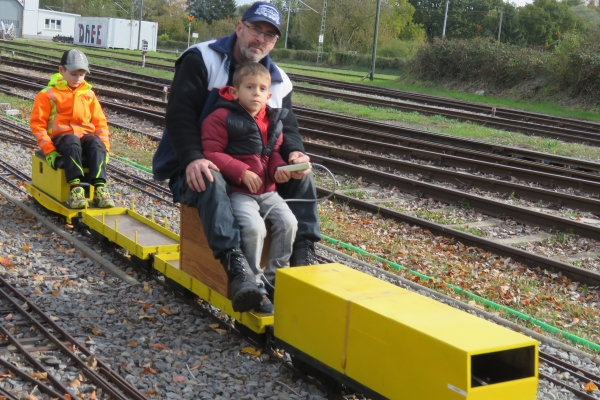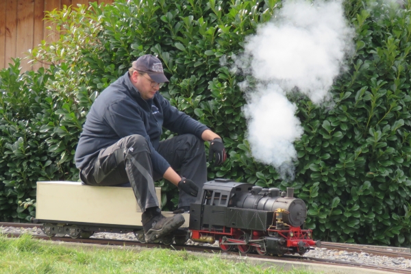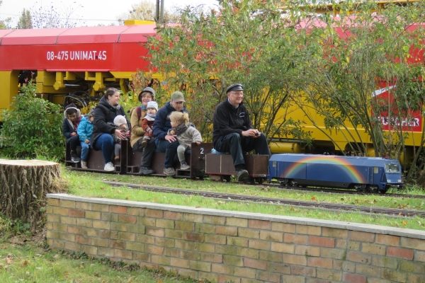 | Der Fahrbetrieb lief bereits bei meinem Eintreffen und es stand bereits eine recht lange Schlange Wartender vor dem Bahnhof. Langsam und mit Vorsicht kam ich im Schritttempo durch um hinten meine Eisenbahnsachen auszuladen. Später als ich das Auto nach draußen bringen wollte, erhielt ich die Erlaubnis mein Auto im Gelände zu parken, da immer noch sehr viele Personen die Durchfahrt nach draußen blockierten und vor dem Gelände durch die großen Schutthalden der Bahn sowieso kaum eine Parkmöglichkeit bestand. So kam ich dann doch recht bald zum Eisenbahnfahren. |