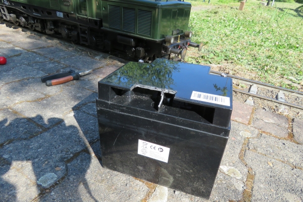 Beim Zusammenbau der E94 (sie wird in vier Kisten transportiert) passte irgendwie das Dach nicht richtig. Es dauerte schon ein Wenig bis ich merkte, dass ein Motor der Pantografensteuerung an einen der Akkus anstößt. Bisher passte ja alles. Aber nun hatte ich neue Akkus, die nun zum ersten Mal in der E94 verwendet wurden. Und bei den neuen Batterien (mit den selben Abmessungen wie die alten) sind die Griffmulden im Gegensatz zu den alten bis an den Rand vorgezogen, sodass die obere Kante eben weiter außen ist und am Motor im Dach anstößt. Mittels einer Säge wurde diese Griffmulde so weit gekürzt, dass es nicht mehr zu einer Berührung mit dem Motor im Dach kam. Ein Umbau der Motormechanik wäre viel zu umfangreich. |