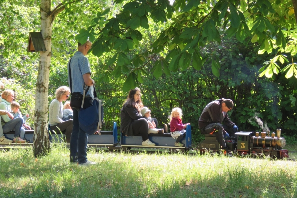 | Der Fahrtag war rundum passend, denn wir hatten ein prima Wetter mit viel Sonnenschein ohne dass es zu warm wurde. Und auch der Betrieb auf den Gleisen war lebhaft aber nicht so intensiv, dass man beim Fahren in seinem "Rhythmus" gestört wurde. Ich konnte gut und bequem fahren konnte; lediglich am Signal mit den Achszählern kam es hin und wieder zu einem kleinen Stau. Die Personenbeförderung wurde mit bis zu vier Zugeinheiten durchgeführt, dazu kamen drei Gastfahrer mit Loks und Waggons, einer eben ich mit dem Bärenzug. |