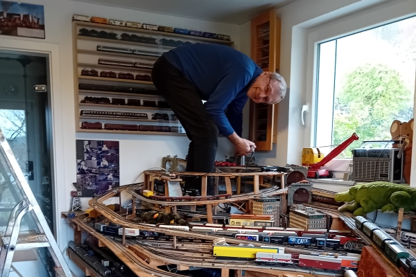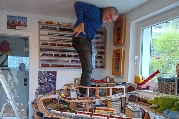 Mit meiner alten Märklin H0-Anlage spiele ich nicht so oft. Im Winter oder bei schlechtem Wetter noch eher als im Sommer an schönen Tagen, da spiele ich lieber draußen mit der Gartenbahn oder gehe gar irgendwo auf einen 5-Zoll-Fahrtag. Und doch möchte ich nicht auf das Fahren mit meinen alten Märklinsachen verzichten. Und daher wird immer wieder der Strom eingeschaltet und ein paar Runden auf der Anlage gefahren. Meist mit den Zügen, die gerade auf den Bahnhofsgleisen stehen, ein Zugwechsel mit dem Schattenbahnhof ist derzeit eher schwierig. |