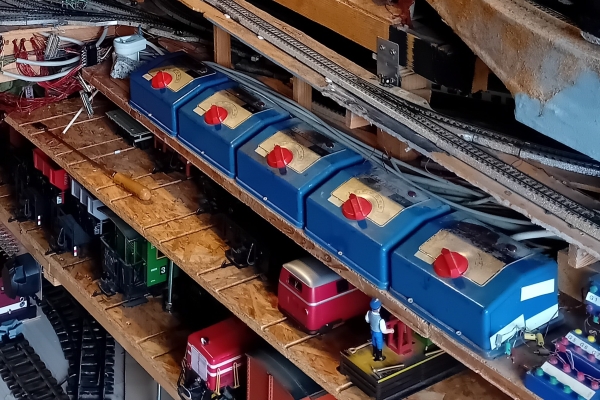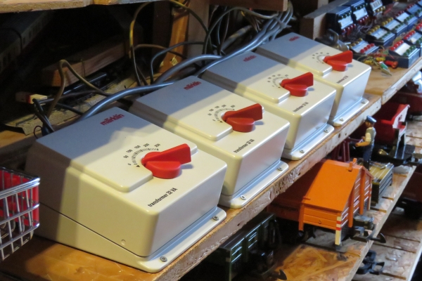 Und das Fahren und Spielen auf der Anlage ist nun deutlich leiser geworden, denn ich haben nun die alten blauen märklintypischen Trafos gegen aktuelle weiße Trafos getauscht. Dafür gab es zwei Gründe. Zum ersten nervte mich inzwischen das laute Gebrumme der Netzfrequenz von den alten Trafos. Es war im Eisenbahnzimmer einfach nur laut durch die fünf blauen Fahrtransformatoren ohne dass überhaupt ein Zug fuhr. Nun sind vier flüsterleise weiße Trafos installiert und es ist nichts mehr von Gebrumm zu hören. Vier reichen nun, da die Anlage nach dem Umzug keine Oberleitung mehr besitzt. Jetzt hört man nur das Geratter der fahrenden Züge auf den Metallgleisen. |
