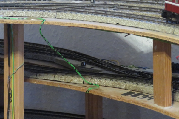 Etwas mehr Mühe bereitete mir noch die Weiche ganz hinten auf der Anlage, für die keine Knöpfchen an den zahlreichen Bedienpulten zum Umstellen der Fahrtrichtung gefunden wurde. Es blieb mir nichts anderes übrig als zwei neue Drähte an diese Weiche ganz weit nach hinten zu verlegen. Hierzu musste ich per Leiter auf die Anlage in den Gleiswendel steigen und in gebückter Haltung die beiden grünen Telefonkabeldrähte anlöten. Schwierig war das, aber nun ist auch diese Bogenweiche wieder per Knopfdruck schaltbar und somit der obere kleine Bahnhof wieder erreichbar. |