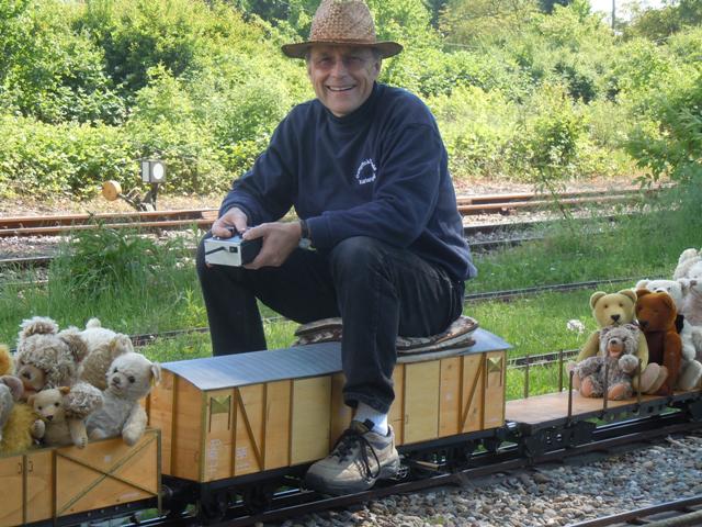 Mein Auto war für diese Veranstaltung randvoll; dabei war der komplette Bärenzug mit der großen Lokomotive und den sieben Waggons, drei Tragetaschen voll Teddys und dazu meine Frau und ich. Der „große Fuhrpark“ sollte es schon sein, denn ich wollte mit meiner Frau zusammen auf dem vierachsigen Sitzwagen fahren und an der Karlsruher Steigung sollte auch ausreichend Kraft für den langen Zug vorhanden sein. Und zudem war beim letzten Mal nur eine Minimalausstattung (nur die kleine Lok und dein Sitzwagen) im Einsatz: da sollten diesmal schon ordentlich viele Bären dabei sein. |