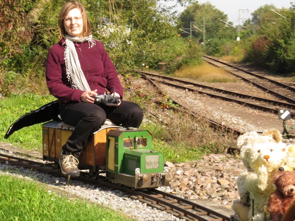 Wolfgang, der Erbauer dieses Waggons, war ebenfalls gekommen. Er hatte neben seiner V60 auch eine neu gebaute Lok mitsamt dem zugehörigen Bedienwagen dabei, um diese hier in Karlsruhe Probe zu fahren (das übernahm hier Schorsch). Leider entgleiste der Bedienwagen häufiger, ohne dass unmittelbar eine Ursache erkennbar gewesen wäre. Letztlich nahm Wolfgang diesen Bedienwagen von den Schienen und bat mich, ihm seinen Ex- Vierachser für das Probe fahren zu überlassen. Kein Problem, die hier mitfahrenden Stoffkrokodile wurden dann auf den Sitzwagen des Bärenzuges umgesetzt. |