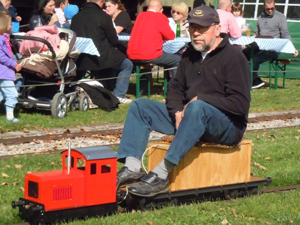 Ein bisschen Oktoberfest bildete den Themenrahmen dieses Fahrtages. Es gab zusätzlich zum üblichen Angebot Weißwürste, süßer Senf, Brezeln und Weizenbier. Thomas hatte es sich nicht nehmen lassen, mit Lederhose und Filzhut die Weißwürste zu servieren. Nach getaner Arbeit konnte er dann mit seiner Lok auch noch ein paar Runden drehen. Meine beim letzten Fahrtag vergessene Regenplane hatte ich wieder zurück erhalten; benutzen musste ich sie jedoch nicht. Das Wetter war den ganzen Tag sonnig; erst gegen den späteren Nachmittag zog eine geschlossene Wolkendecke auf. Es blieb jedoch trocken. |