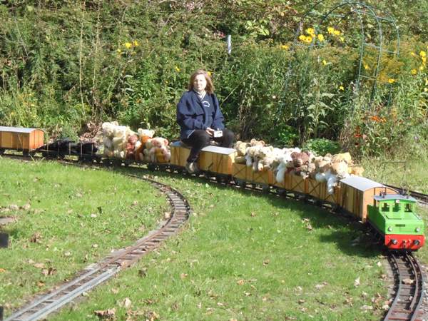 Dann wollten Susanne und ich aber auch noch meine ältere kleine Diesellokomotive benutzen. Leider zeigte es sich, dass die in die Lokomotive eingebaute Batterie eine zu geringe Spannung hatte, obwohl diese über Nacht ans Ladegerät angeschlossen gewesen war. Möglicherweise ist dieser Akku defekt; das wäre noch zu überprüfen. Der zugehörige Bedienwagen wurde somit ebenfalls aus dem Zugverband des Bärenzuges herausgelöst, dass sowohl Susanne als auch ich eigenständig fahren konnten. Der Bärenzug wurde also nochmals um einen Wagen kürzer. |