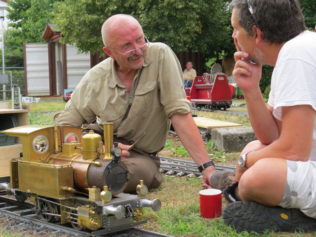 Ganz besonders gefiel mir die kleine nicht lackierte Dampflokomotive. Es war genau mein Geschmack, das Material so „nackt“ und blank zu sehen. Eisen, Messing und Kupfer ergänzten sich hierbei wunderbar und dazu blieben alle Details und Kleinigkeiten eben so wie sie sind und werden nicht durch Farbe verdeckt. Für mich ein wunderbares Schmuckstück. Am Vormittag fuhr das Maschinchen seine Runden, später musste es abgestellt werden, da die kleine Edelstahlkugel im Regler „hing“; aber das kannte der Besitzer schon. Er würde mit Druckluft „rückwärts“ die Kugel wieder lösen und so den Schaden beheben. |