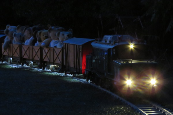 Ein Wochenende allein zu Hause nutzte ich, um sowohl am Samstag als auch am Sonntag Eisenbahn zu fahren. Samstags war in Bischofsheim ein Nachtfahrtag; Beginn war erst ab 17:00 Uhr. So hatte ich ausreichend Zeit, meine Sachen zu richten und doch trotz Verkehrsprobleme (Autobahnsperrung) rechtzeitig vor Ort zu sein. Die Begrüßung war herzlich und nachdem ich mir den Gastfahrerausweis abgeholt hatte, konnte ich meinen Bärenzug aufs Gleis stellen. |