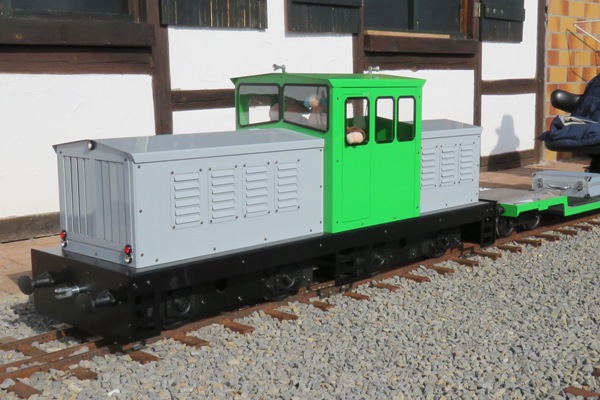 Volker traf ich zum ersten Male mit seiner neuen 7 ¼-Zoll-Lokomotive an; das war schon ein recht großer Brocken. Aber leider fuhr die Lokomotive keinen einzigen Meter, denn die Funksteuerung funktionierte nicht. Zur Erinnerung, genau hier in Schönborn hatte ich Schwierigkeiten mit meiner Funksteuerung von Mathias und Volker konnte mir vor Ort helfen. Gerne hätte ich ihm dieses Mal geholfen, die baugleiche Steuerung zu überprüfen, er wusste jedoch schon, woran der Fehler lag. Er hatte am Vorabend die Steuerung nochmals umprogrammiert, da die 7 ¼-Zoll-Lokomotive ein anderes Bremsverhalten besaß als seine 5-Zoll-Lok. Und plötzlich waren alle Parameter weg. Er müsse nun die ursprüngliche Programmierung wieder neu laden und alles wäre wieder in Ordnung, aber eben erst wieder zu Hause. |