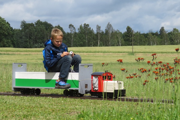 | Tim und sein Vater waren Samstag und Sonntag gekommen und hatten sowohl die elektrische als auch ihre Dampflokomotive dabei. Und dennoch wollte Tim auch mal mit dem Bärenzug einige Runden fahren. Für mich die Gelegenheit, den Zug auf der schön gestalteten Anlage fotografieren zu können. Die Dampflokomotive von Tim hatte dann leider am Sonntag einen Defekt. Irgendwie hatte die Lokomotive nicht die gewohnte Kraft und Tims Vater fand dann die Ursache: die Maschine arbeitete nur noch auf einem Kolben, da der Verbindungsstift zwischen Kolbenstange und Kreuzkopf auf einer Seite gebrochen oder verloren gegangen war. |