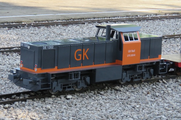 | Karlheinz hatte seine neue Lokomotive mitgebracht: eine MAK. Eigentlich das gleiche Modell, wie es schon seit einiger Zeit bei uns im Verein in Karlsruhe unterwegs ist. Nun hatte Karlheinz seinen Bausatz endlich fertig gebaut, wenn auch noch einige Teile fehlen, wie Fenster und die typischen Geländer. Als Beladung für die Flachwaggons hatte Karlheinz so wie Wilhelm auch Styropurblöcke befestigt, welche mit ihrem Muster ein wenig nach Granit wirkten. |