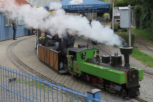 Dennis, Wolfgangs Enkel, war nicht mitgekommen. Da Wolfgang selbst nicht lange auf dem Bedienwagen seiner Dampflokomotive sitzen konnte, war Gelegenheit für andere, den Regler der 81er in die Hand zu nehmen. Erstmals sah ich Udo eine Dampflokomotive fahren. Wolfgang und Udo wechselten sich mehrfach ab, und auch mir bot Wolfgang an, die 81er zu fahren. Da ich jedoch erst den Bärenzug die Runde zu Ende fahren musste, um diesen auf einem geeigneten Gleis abzustellen, fuhr auch Wolfgang noch einmal die Strecke. Dabei verschätzte er sich mit dem Nachlegen der Kohle und als ich soweit gewesen wäre, die Dampflokomotive zu übernehmen, war der Dampfdruck nicht mehr ausreichend zum Weiterfahren. Natürlich hätte er das Feuer rasch wieder auflegen können, aber im Hinblick auf die baldige Heimfahrt und das notwendige Abrüsten der Lok, verzichtete ich dann auf die Fahrt mit der Dampflok. |