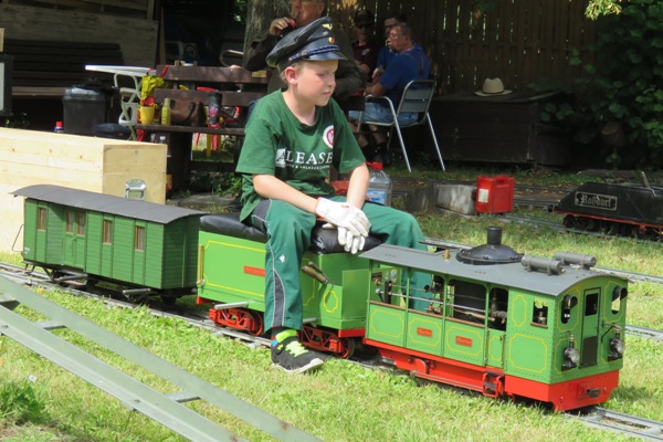 | Die beiden Enkelkinder eines Rossdorfer Vereinsmitgliedes wollten dann mal bei den Teddys mitfahren. Das Mädchen kuschelte sich so sehr an „Petz“, dass der Wagen einmal mit dem Mädchen umkippte und entgleiste; aber es passierte ihr nichts. Später dann der Dreijährige bei mir auf dem Bedienwagen. Er fuhr brav und still Runde um Runde. Irgendwann kam dann Mama und fragte, ob er denn nicht wieder bei Opa mitfahren wolle: Kopfschütten. Noch mit den Teddys fahren? Kopfnicken. Also durfte er noch ein paar weitere Runden bei mir auf dem Zug bleiben. |