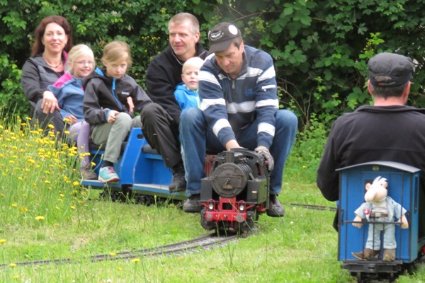 | Im PKW-Anhänger waren meine gesamten 5-Zoll-Sachen. So könnte ich ja nach der jeweiligen Situation, die eine oder andere Lokomotive und nur den passenden Bedienwagen oder alle Waggons des Bärenzugs verwenden. Gerade, als ich beginnen wollte, Fahrzeuge des Bärenzuges auszuladen, begann es zu tröpfeln. Insgesamt regnete es nicht wirklich viel, aber es bewirkte ein Gedankenumschwung und ich stellte lediglich die kleine grüne Lok und den passenden Sitzwagen dazu auf das Gleis; die offenen Wagen blieben im Anhänger Bären in den Taschen. Und obwohl es dann den ganzen Tag über trocken blieb, beließ ich es dabei und fuhr nur mit meiner kleinen und dem einen Waggon. |