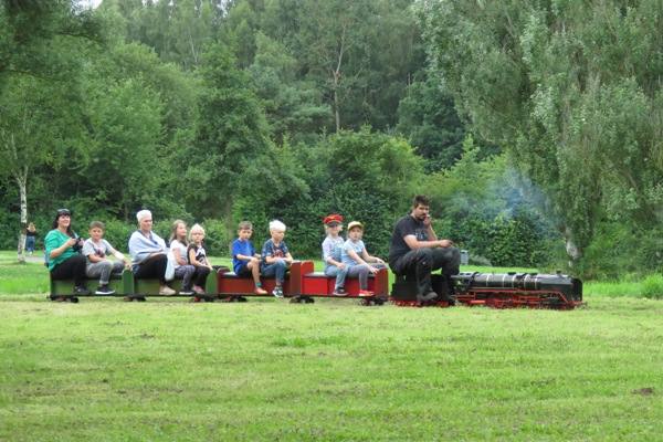 | Die 56er Dampflokomotive fährt auf 7¼-Zoll-Gleisen, die angehängte Zuggarnitur zur Personenbeförderung rollt auf 5-Zoll-Rädern. Aktuell bestehen nur eingeschränkte Fahrmöglichkeit für 7¼ Zoll. Eine Erweiterung insbesondere im Bahnhofsbereich erfordert zahlreiche neue Weichen für die kombinierte Spur. Vielleicht ein Grund, weshalb die Personenbeförderung auf 5 Zoll erfolgt. |