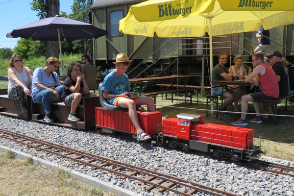 Es war Bärenfahrtag: jeder Besucher mit Stofftier (es muss nicht unbedingt ein Teddy sein) durfte kostenlos bei der Personenbeförderung mitfahren. Und dann kam ein Gast mit einem riesigen Stoffbären. Dieser „stand“ (mit einem Schal festgebunden) dann längere Zeit im Bahnhof bei den Kindern, aber er kam einfach beim Mitfahren nicht dran. Ich fragte darauf hin den Vater der Kinder, die zu dem Bären gehörten, ob dieser nicht auch mitfahren wollte. Und so kam es zu einer Rundfahrt mit dem sehr großen Teddy. Ich hatte diesen vor mir auf dem Sitzwagen und musste schon sein Ohr umlegen, um an ihm vorbei sehen zu können. Nach der Runde holten die Besitzer ihren Bären wieder ordnungsgemäß am Bahnhof ab; die beiden Kinder hatten an ihrem riesigen Teddy "Thomas" schon gut zu schleppen. |