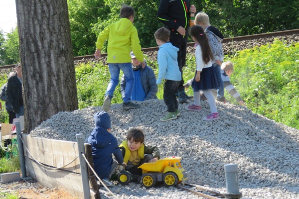 Auf einem Teilstück von Franks LGB-Anlage wurden Gleise extra Gleise verlegt, um eine Kohle gefeuerte 45mm-Dampflok auszuprobieren und zu testen. Die in Bau befindliche „Heidi 2.0“ von Jonas war kurz aus dem Schuppen geholt worden. Hier wurde die aktuelle Bauphase gezeigt und umgekehrt war zu sehen bzw. zu erahnen, was noch zu tun ist. Ach ja, so ein schöner Schotterberg ist ein toller Spielplatz. Doch leider wird der Schotter für die Verlegung der neuen Gleise benötigt, also nichts dauerhaftes zum Spielen. |