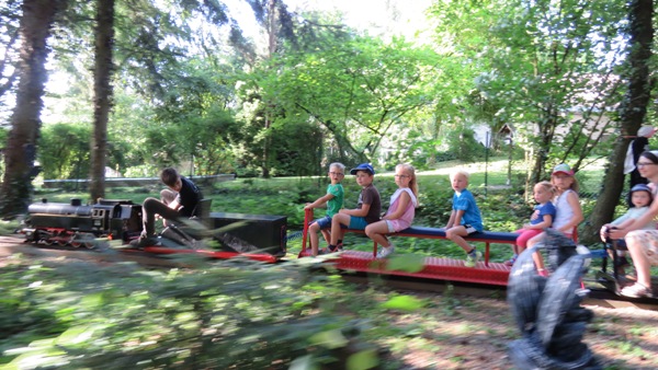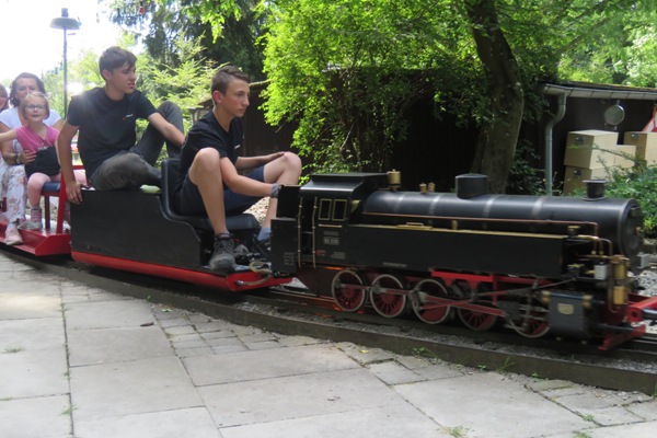 Unsere kurzfristige Anmeldung ergänzte die überschaubare Zahl der Gastfahrer. Es war eine Gastfahrergruppe aus Dresden gekommen, eine weitere aus Österreich und mehrere Personen aus der französischsprachigen Schweiz. Mit zwei Jungs kam ich kurz ins Gespräch, da sie doch recht gut Deutsch sprachen, sie gehörten zur Anlage in Bouveret. Die Personenbeförderung erfolgte auf dem Aussenkreis, die Gastfahrer waren auf dem Innenkreis unterwegs, ergänzt durch Probe- und Schulungsfahrten von Vereinsmitgliedern. Eine junge Dame übte mit einer Feldbahnlokomotive mit Verbrennungsmotor und man sah ihr die Freude am Fahren an. |