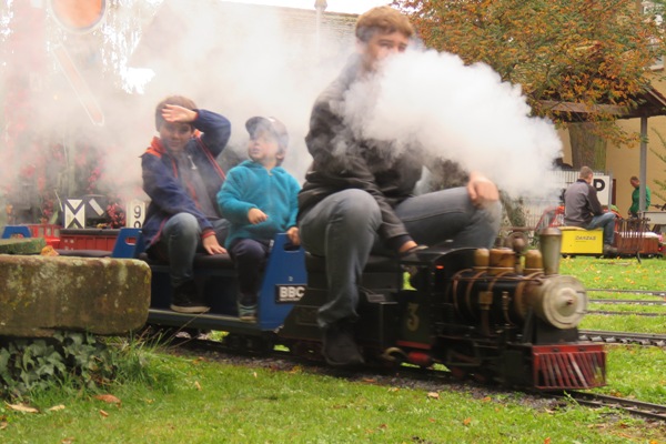 Der Wettervorhersage, dass es nicht regnen würde, traute ich nicht so sehr, sodass ich mich wieder einmal mehr für eine recht kleine Eisenbahnzusammenstellung entschied: nur die kleine Lokomotive und den zugehörigen Sitzwagen. Somit keine Waggons für Teddys, sondern einen einzigen Kuscheltiervertreter nach dem Moto: einer für alle; und diesen musste ich dann auch noch während der Fahrt festhalten. Natürlich wurde nach den anderen gefragt; der komplette Bärenzug wird in Friedrichshafen auf der Faszination Modellbau beim Echtdampfhallentreffen unterwegs sein. |