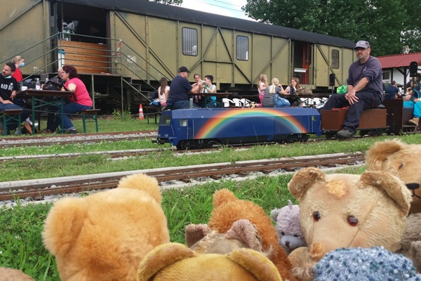 Einen „großen“ Fahrtag sollte es werden, also mit komplettem Bärenzug. Susanne und Jochen hatten sich ebenfalls angekündigt und so war klar, dass noch eine weitere Fahrmöglichkeit geschaffen werden musste. Jochen hatte mir im Vorfeld geholfen alle meine 5-Zoll-Fahrzeuge wieder in den PKW-Anhänger einzuladen, sodass alles zur Verfügung stand. Als zweite Garnitur wurde die kleine grüne Lok mit Bedienwagen und dem Rungenwagen zusätzlich bereitgestellt, da die beiden mit vielen Stoffkrokodile gekommen waren und diese natürlich auch gefahren haben wollten; ergo ein Waggon weniger am Bärenzug, der aber immer noch lang genug war und allen Teddys, die dabei waren ausreichend Platz bot. |
