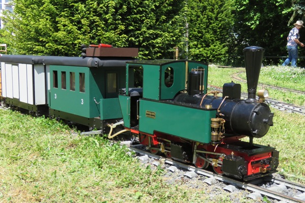 Und beim Aufgleisen zeigte es sich, dass an dem einen Sitzwagen der Zughaken falsch herum montiert war. Nach dem Sturz meiner Frau in Karlsruhe war ja ein Haken abgerissen und den hatte ich natürlich wieder neu montiert, wie sich nun zeigte aber mit dem Schlitz nach unten. Ein Versuch, so auf die Strecke zu gehen scheiterte total, denn sobald die Schraubenkupplung nur leicht entlastet wurde, gab es eine Zugtrennung. So konnte nicht gefahren werden. Ich stellte den betreffenden Wagen zur Seite und wollte die Runde beenden, um den Zughaken dann umzudrehen. Da kam dann Felix und erklärte, dass er dies gerne rasch machen würde. Und ich hatte noch nicht eine Runde beendet hatte Felix schon das kleine Missgeschick beseitigt; vielen Dank dafür. |