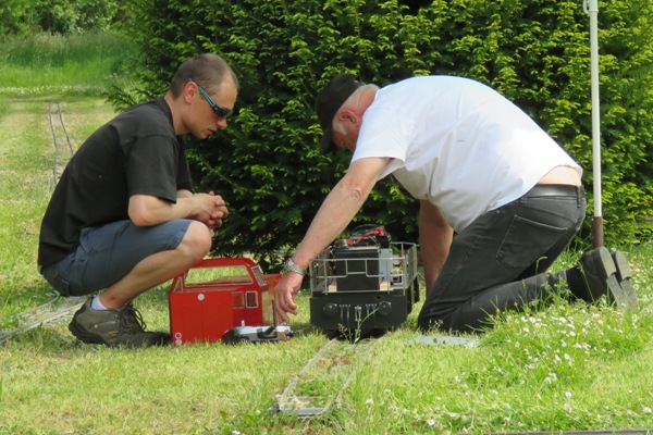 Die MAK, die Wolfgang fahrfertig aufbereitet hatte, wurde ein Stückchen rangiert, danach reagierte sie nicht mehr auf die Funksteuerung. Dabei sollte die Lokomotive von ihrem neuen Besitzer gefahren werden. Wolfgang holte sich Hilfe von Andreas, der überprüfte nochmals alles und mehr oder weniger plötzlich funktionierte alles und die Lok ließ sie sich wieder richtig steuern. Übrigens war der Rasen der Anlage lediglich eine Rasenmäherbreite links und rechts vom Gleis gemäht. Eine Vorgabe vom Ort besagt, dass die übrige Wiese für Insekten nicht geschnitten werden sollte. |