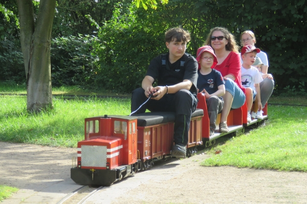 Auch Eric mit Bruder und Mutter traf ich. Leider sieht sie nicht mehr so gut und erkennt nur wenige. Sie kommt aber gern um sich mit denen zu unterhalten, die sie noch von früher kennt. Die Köf von Daniel fuhr funkgesteuert solo über die Strecke. Ein wenig so wie ich es mit meiner kleinen grünen Lok auch machen möchte. Nur eben idealerweise mit einem Kesselwaggon dran. |