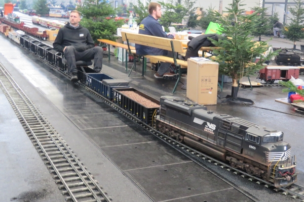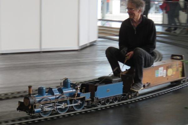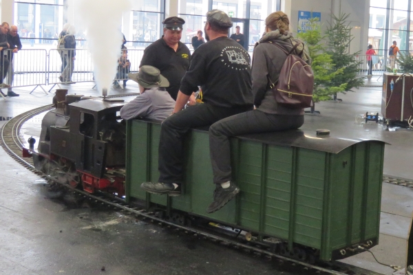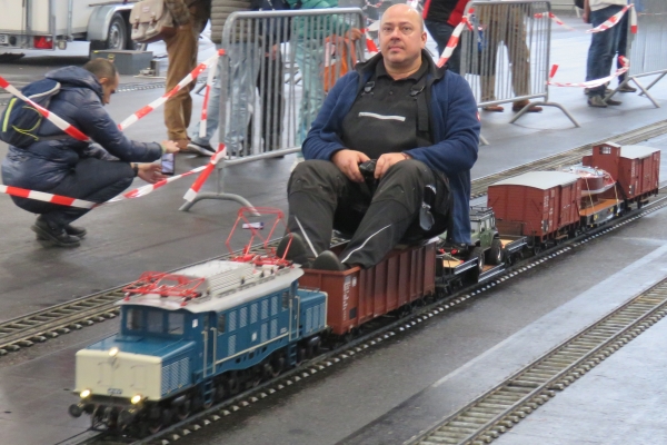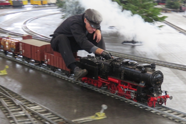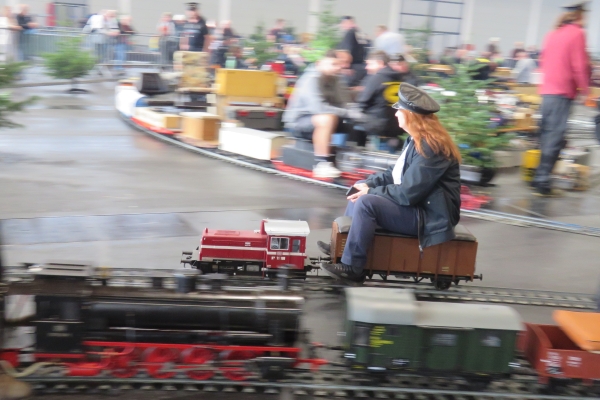 Interessanter weise hatte der Zug von Christian mit der E94 einen Sitzwagen nur für eine Person, während der Bedienwagen für Christians Köf Platz für zwei Passagiere bot. Zunächst fuhr ich für einige Runden die E94, Christian und Susanne die Köf. Später tauschten wir und ich war mit der Köf auf der Strecke. Nach einer Runde wurde diese immer langsamer und ich ahnte, dass die Batterie mehr als nur schwächelte. Letzten Endes kam ich nicht drumherum die Köf über den größten Teil der 5-Zoll-Strecke zu schieben um keinen Stau zu verursachen. So mancher Besucher am Rande machte von diesem Missgeschick Fotos, aber das kann eben immer mal vorkommen. |