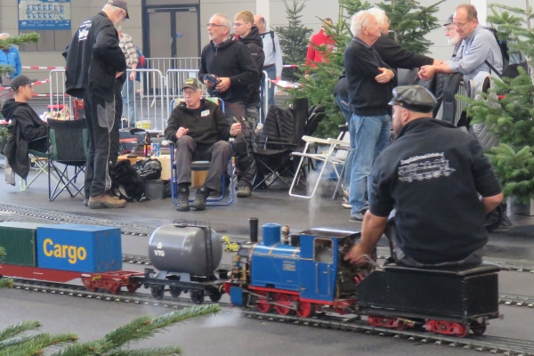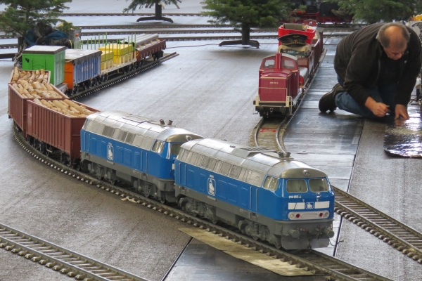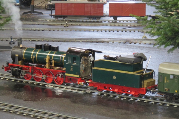 Die Eisenbahnanlage für 5 Zoll und die für 7 ¼ Zoll war in etwa wie in den vorigen Jahren aufgebaut worden, nur um die Abstellgleise waren Veränderungen durchgeführt worden, um die Platzangebote zu verbessern. Insgesamt war die Anlage sehr gut ausgelastet, denn alle Abstellgleise waren belegt und mehr Züge waren auf der Strecke kaum möglich ohne dass der Betrieb ins Stocken hätte kommen können. Somit war ständig ein recht lebhafter Betrieb auf den Gleisen und die Besucher konnten jederzeit abwechslungsreichen Eisenbahnverkehr beobachten. Durch den umfangreichen Betrieb wurden bereits am Freitagnachmittag die Gleise rutschiger und es musste feinfühliger gefahren werden, damit die Antriebsräder nicht schleuderten. |