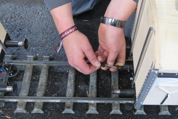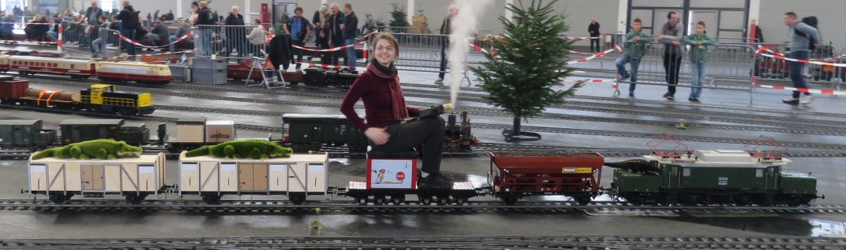 Mit Christian hatte ich bereits einige Tage vorher Kontakt und es war ihm ein Selbstverständnis Susanne und mir seine Fahrzeuge zum Mitfahren anzubieten. Die Freude über das Wiedersehen war auf beiden Seiten groß und ganz schnell waren zwei große grüne Krokodile auf Christians neuen Waggons platziert. Diese neuen Wagen sollten eigentlich als weitere Sitzwagen genutzt werden, leider drücken Teile der Bremse auf die Achse, wenn der Wagen belastet wurde, ergo konnte sich derzeit niemand darauf setzen außer den grünen Stofftieren. Die beiden neuen noch unlackierten Waggons hatten dann im Laufe des Tages noch eine Zugtrennung. Durch die kleineren Erschütterungen beim Fahren hatte sich die Schraubenkupplung dazwischen vollständig aus dem Gewinde herausgedreht und so den letzten Wagen abgehängt. Rasch war dies wieder in Ordnung gebracht, aber die Gewindeenden müssen für die Zukunft gesichert werden.Und das schwarze Molli-Kroko saß dann rasch auf der E94; also fast wie vor ein paar Jahren. Und so war ganz schnell der Zusammenhang von Stoffkrokodil und Eisenbahnkrokodil gegeben. |
