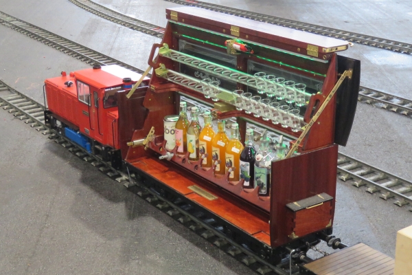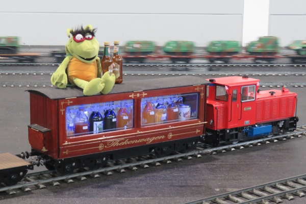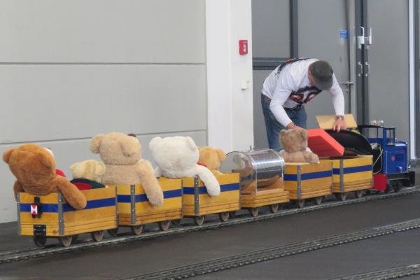 Noch ein paar Details. Wolfgang Fischer entgleiste wie andere zuvor auch mit seiner Dampflokomotive BR23 auf einer Weiche zur Abstellgruppe. Man erkannte, dass die Weichenzunge nicht mehr richtig am Schienenprofil anlag. Norbert passte daher die Schienenprofile der Weiche vorsichtig mit einer Flex an. Danach kam es nicht mehr zu Entgleisungen an dieser Weiche. Garrelt war mit zahlreichen Fahrzeugen von Borkum gekommen. Am Markantesten war wohl sein Thekenwagen mit verschiedenen alkoholischen Angeboten. Immer wenn dieser Thekenwagen geöffnet wurde kamen recht bald eine größere Gruppe rund um diesen Sonderwagen zusammen und ließen sich die Leckereien schmecken. Und aufgefallen ist mir ein Feldbahnzug mit offenen Wagen und größeren Teddys darin. Ein Bärenzug so wie der meine war das allerdings nicht. |