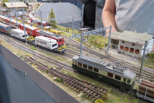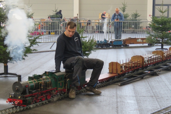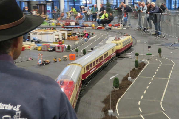 Natürlich trug ich mein Sweatshirt und die zugehörige Fleecejacke mit dem Aufdruck meines Vereins der Karlsruher Dampflokfreunde. Aber ich war in den Eisenbahnhallen nicht der einzige mit diesem Logo auf der Kleidung. Ich traf den „halben“ Verein gemeinsam beim Eisenbahnfahren; obwohl ich „nur“ Besucher war, schaute ich natürlich am entsprechenden Standort in der Halle vorbei. Einige Vereinskameraden hatten beim Gleisaufbau der beiden Anlagen geholfen und waren deshalb schon länger Zeit hier auf der Messe und hatten sich daher mit ihren Fahrzeugen und allen Extras „gemütlich“ eingerichtet. |