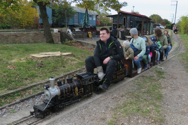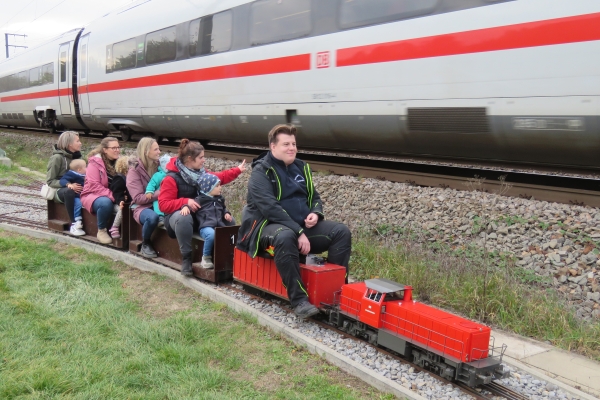 | Der Fahrbetrieb lief bereits bei meinem Eintreffen und es stand bereits eine recht lange Schlange Wartender vor dem Bahnhof. Langsam und mit Vorsicht kam ich im Schritttempo durch um hinten meine Eisenbahnsachen auszuladen. Später als ich das Auto nach draußen bringen wollte, erhielt ich die Erlaubnis mein Auto im Gelände zu parken, da immer noch sehr viele Personen die Durchfahrt nach draußen blockierten und vor dem Gelände durch die großen Schutthalden der Bahn sowieso kaum eine Parkmöglichkeit bestand. So kam ich dann doch recht bald zum Eisenbahnfahren. |