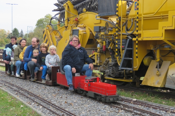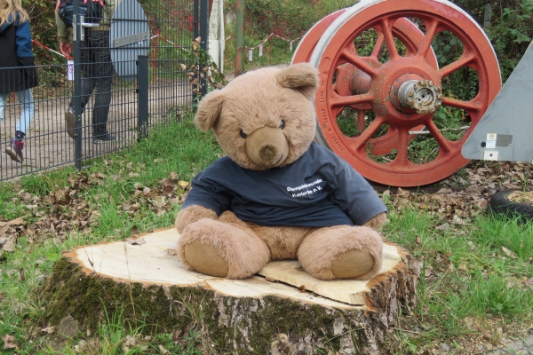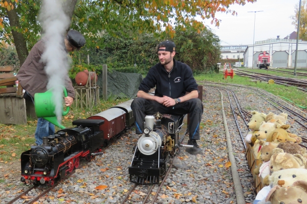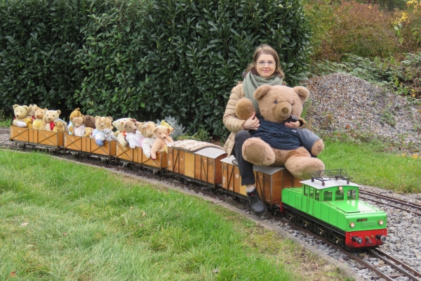 | Wegen der immer noch vorhandenen Schuttberge der Bahn vor der Anlage war die Parkplatzsituation erneut schwierig, sodass ich erst gar nicht mit dem PKW-Anhänger nach Karlsruhe kam. Im Auto hatte ich die E22, zwei Sitzwagen und drei offene Teddy-Waggons mit 18 Bären. Mehr ging nicht, da auch meine Frau mit nach Karlsruhe kam um hier Susanne zu treffen, die dann als sie kam noch drei weitere Kuscheltiere mitbrachte. Ein kleinerer Teddy konnte noch in einem Wagen dazu gesetzt werden, die beiden größeren mussten mit auf die Sitzwagen, wobei der ganz große Petz auf einem Pappelstumpf auf mich wartete. |