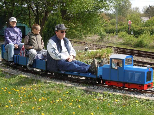 Mit zwei Lokomotivführern und einer Lokomotivführerin wurde der Bärenzug recht intensiv gefahren, sodass am Nachmittag die Fahrbatterie gewechselt werden musste. Lediglich zu einer Mittagspause parkte der Zug auf einem nicht benutzten Gleisabschnitt eine gewisse Zeit. Am Regler waren wir drei abwechselnd alle nacheinander, auf dem Zug häufiger alle drei gleichzeitig. So hatte ich zunächst Bedenken, ob wir mit drei Personen und fünf Waggons die Karlsruher Steigung schaffen würden. Der Zeiger des Amperemeters im Dach der Lokomotive war deutlich über den letzten Skalenwert hinaus, sodass der Regler zurück genommen werden musste, damit nicht die Motorsicherung noch anspricht. Zur Erinnerung, dies war schon mal geschehen, dass die 30-A-Sicherung „durch“ war. Langsamer als sonst ging es auf diesem Streckenabschnitt vorwärts, aber die kleine Lokomotive brachte uns gut den Berg hinauf. Durch das ausgesprochen gute Wetter (es war ja noch April) kamen recht viele Besucher auf die Anlage und genauso mehrere Gastfahrer mit ihren Fahrzeugen und Zügen. Das bringt natürlich Leben auf die Anlage und ab und zu auch mal Stau bei entsprechend höherem Verkehrsaufkommen. |