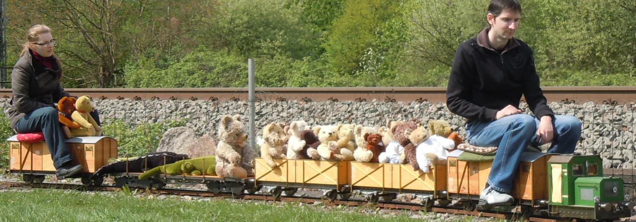 Die Freiluftsaison 2011 begann ich wie letztes Jahr bei meinem Verein in Karlsruhe. Mit Roy und Susanne fuhr ich im Auto voll beladen zur Anlage in Bulach. Dabei hatten wir meinen kompletten Zug mit den fünf Waggons, recht viele Teddybären und einige von Susannes Krokodile. Da Roy keine eigenen Fahrzeuge mitnehmen wollte, fuhren er und Susanne bei mir mit; mit etwas geschicktem Beladen klappte das auch mit nur einem Auto. Weniger gut klappte es dann, die ganze Bärenschar in den beiden offenen Waggons unterzubringen, denn ich hatte wieder zwei neuere größere Bären zusätzlich dabei. So saß dann am Ende der dicke Teddy Hermann bei den Krokos mit auf dem eigentlich für die Reptilien reservierten Vierachser und Strubbi und Strolchi saßen auf den Sitzwagen mit und wurden vom jeweiligen Mitfahrer festgehalten. Der Bau eines notwendigen dritten Transportwagens für Teddys ist in Angriff genommen, allerdings dürfte wegen anderer vorrangigere Projekte, dessen Fertigstellung noch etwas dauern. |