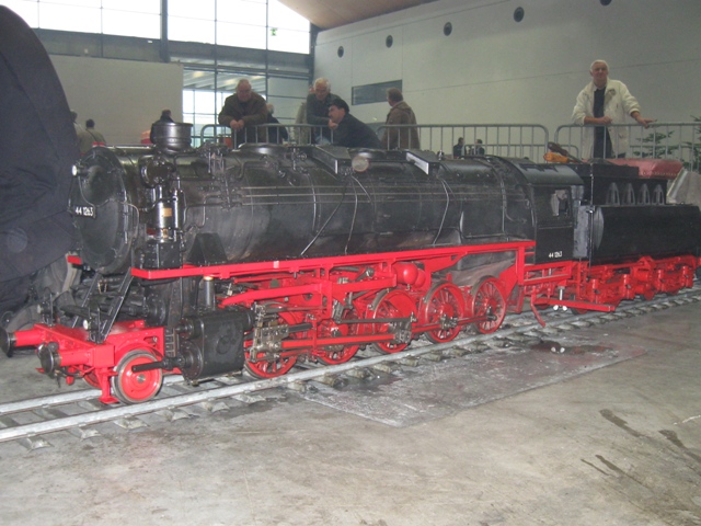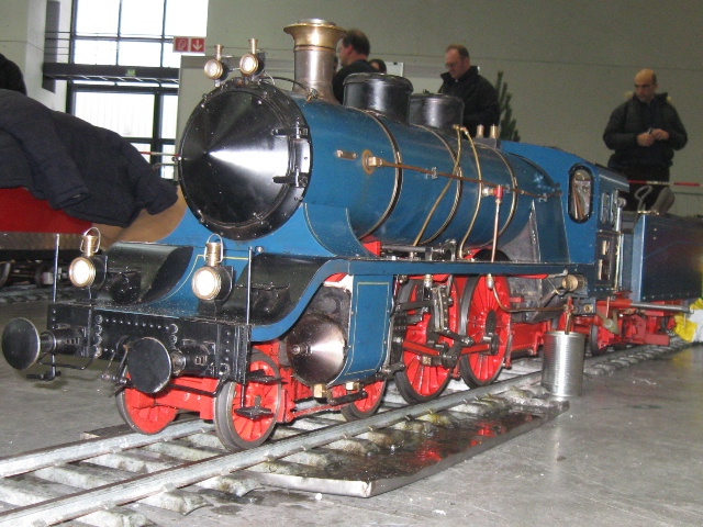 Nicht, dass ich mit meiner Lok vom Bärenzug unzufrieden bin, aber irgendwie würde mich doch eine größere Lokomotive reizen. Ich habe mich daher schon ein wenig auf der Messe nach Größerem umgesehen, noch ganz ohne konkrete Absichten. Bereits in der Baugröße H0 gefällt mir das Modell des deutschen Krokodils, der elektrischen Baureihe 94 sehr gut. Hier auf der 5-Zoll-Anlage in Karlsruhe waren sogar vier Stück unterwegs. Für mich war die Schönste hiervon die von Herrn Ehrle aus Wasserburg, die dieser sowohl als Bausatz wie auch als Fertigmodell an seinem Stand anbot. Fahrfertig kostet sie 12000 Euro, als Bausatz mit allen gelaserten Blechteilen inklusive der nötigen Zeichnungen 2800 Euro. Auf seinem Messestand wurde ein Motorvorbau dieses Modells ausgestellt, um die Detaillierung und die Verarbeitung zeigen zu können. Ebenso attraktiv ist das Angebot einer Vorserien E03, sie kostet fertig rund 10000 Euro. Während auf der Anlage eine fertige 03er mit drei passenden TEE-Wagen ihre Runden drehte, war auf dem Verkaufsstand das Skelett der Lokomotive ausgestellt. Und dann erfuhr ich noch, dass eine Mogul-Dampflokomotive der Familie Deckert zum Verkauf stünde. Ein schönes Modell, aber eben ein amerikanischer Typ; die Lokomotive würde für 6800 Euro angeboten. Es gibt also Möglichkeiten. |