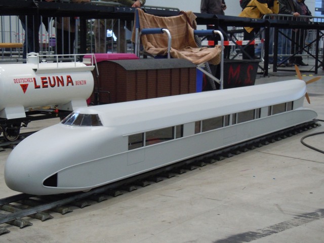 Erek Opiz hatte letztes Jahr mit dem Rohmodell eines Triebkopfes vom VT 11.5 nicht nur mich überrascht. Gespannt war ich, wie dieser nun fertig aussehen würde. Doch ein TEE war nirgends zu sehen (er war nicht zugelassen). Statt dessen hatte die Familie Opiz das fahrfertige Modell eines Schienenzeppelins dabei. Das neue Modell wurde häufig nachgefragt und so hatte Erek ständig jemandem sein neues Modell zu erklären; irgendwann auch mir. Ich erinnerte ihn an ein Gespräch im letzten Jahr während eines Fahrtages in Roßdorf, in dem es um die Planungen für ein neues Modell mit höherem Entwicklungsanspruch ginge; und dabei hatte ich gerade den Schienenzeppelin erwähnt, ohne zu ahnen, dass genau dieser bereits in Arbeit war. Ein tolles Modell dieser Schienenzeppelin. Erek wollte auf jeden Fall eine zweiachsige Ausführung, auch wenn dies dann gegebenenfalls Einschränkungen auf der Anlage bezüglich der befahrbaren Gleisradien gäbe. Ähnlich der Fahrtechnik von Roy und mir, den Bärenzug vom vorausfahrenden oder nachfolgenden Zug aus zu steuern, wird der Schienenzeppelin ebenso gesteuert, denn dieser ist nicht personentragend und auch zum Sitzen auf Grund seiner Form ungeeignet; er muss somit immer von „ferne“ gesteuert werden. Der am meisten erwähnter Hinweis: der Propeller müsste sich noch drehen. Aber das ist bereits vorgesehen, jedoch eben noch nicht richtig eingebaut. |