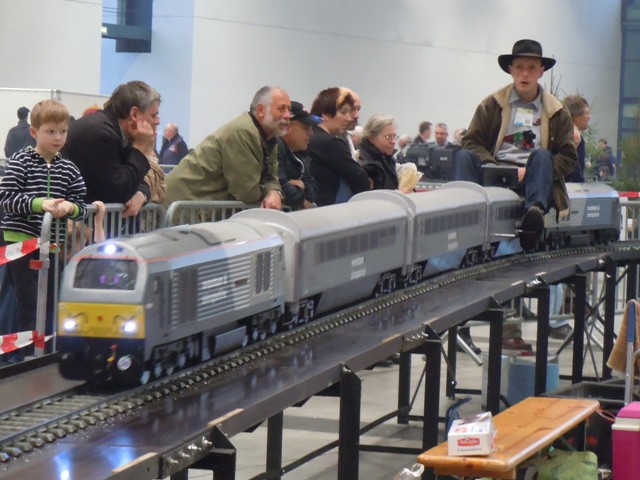 Die Rampe war wie immer eine gewisse Herausforderung für die Lokomotiven, hier bot sich den Besuchern immer wieder interessante Szenen, insbesondere, wenn lange und somit schwere Züge die Steigung hinaufgezogen wurden und die Maschinen mehr oder weniger ihre ganze Leistung zeigen mussten. Die ansteigende Rampe wurde zwar wiederholt gesäubert, jedoch wurde sie durch den intensiven Schienenverkehr immer wieder rutschig und nicht nur meine Lokomotive schleuderte stark an dieser Steigung. Bei Fahrten mit zwei Personen und allen meinen Waggons musste ich mich dann auf der Lokomotive „abstützen“, um so durch meine Gewichtsverlagerung mehr Reibung auf die Schiene zu bringen. Ging dann doch nichts mehr, so hieß es absteigen und neben dem Zug bis zum höchsten Punkt der Strecke nebenher gehen. Glücklicher Weise konnte die Rampe umfahren werden, sodass leistungsschwächere Lokomotiven diesen Streckenteil vermeiden konnten. Roy´s langer Zug war einer jener, die diese Umfahrmöglichkeit gern in Anspruch nahmen, ja in Anspruch nehmen musste. Während einer kurzen Zeit fiel das Licht der tief stehenden Sonne durch die Lichtbänder der Decke, welche die Halle untergliedert. Dies ergab eine ganz tolle Beleuchtung und einige Fahrzeuge standen in einem wunderbaren Licht, das zum Fotografieren wunderbar geeignet war. Meine Lokomotive stoppte ich kurz gerade in einem solchen Lichtstreifen; die messingene E-Lok erwischte ich punktgenau. |