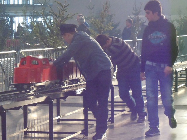 Die Karlsruhe Dampflokfreunde hatten zwar einen eigenen Messestand zur Werbung und Präsentation, aber der Verein trat als solches nicht geschlossen in der Halle 2 auf der 5-Zoll-Anlage auf. Dafür engagierten sich einige Karlsruher Vereinsmitglieder bei der personenbefördernden MaLu-Bahn. Sie halfen beim Auf- und Abbau der kombinierten 5-7 1/ 4-Zoll-Anlage, übernahmen Lokführerdienste und unterstützten die Fahrkartenkontrolle sowie die Wartung der Dampflokomotiven. So hatten doch manche Karlsruher ihren persönlichen Einsatz beim Echtdampfhallentreffen auch ohne eigenes Fahrzeug auf der Schiene.Christian konnte darüber hinaus dann noch außerplanmäßig zur Nachtfahrt seine eigene Lok aufs Gleis stellen und mitfahren. |